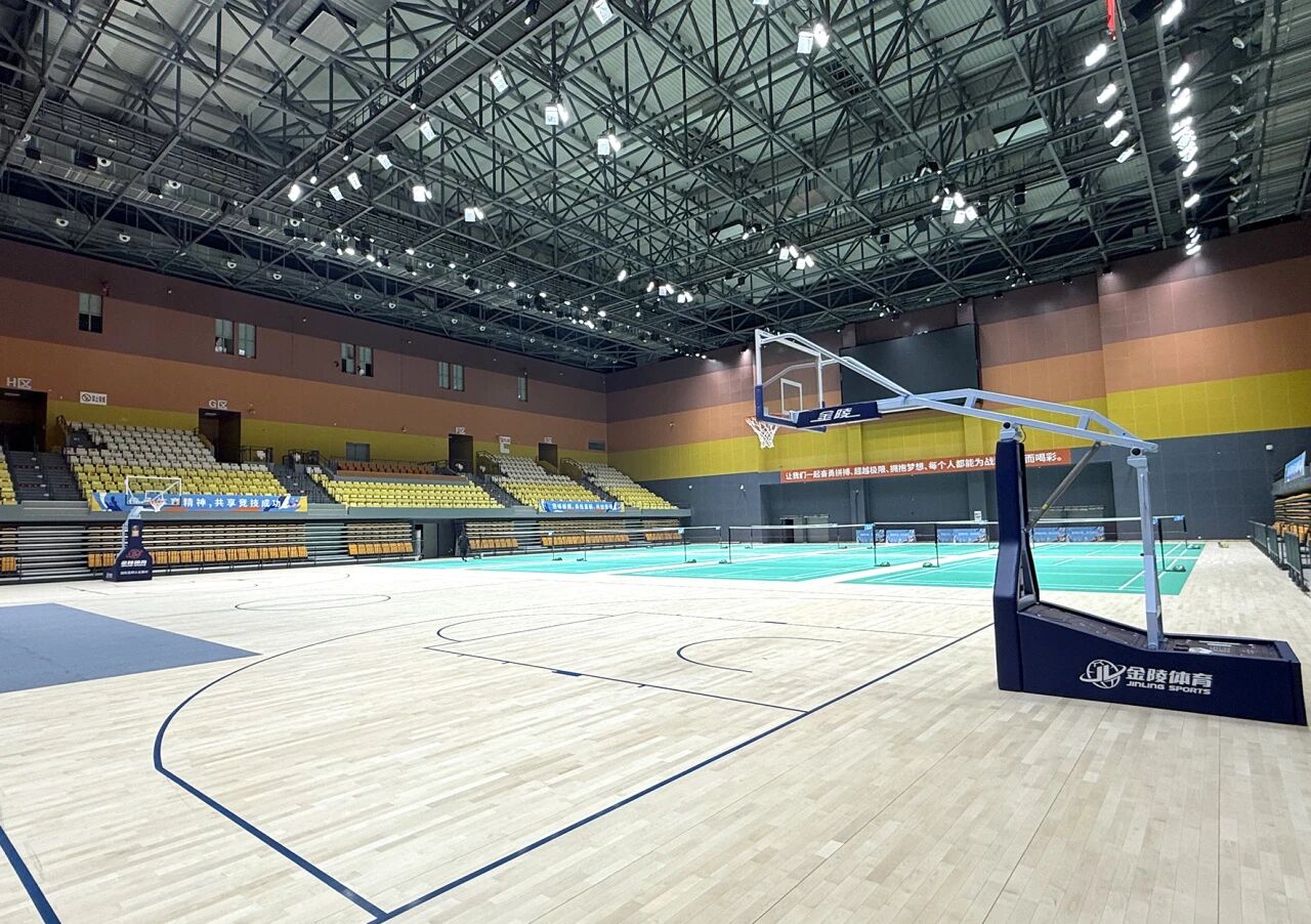 金陵體育以精湛的工藝與卓越的匠心,助力福州晉安打造了一座全新的賽事場館,館中3000多平方米的金陵體育運動木地板,嚴格遵循FIBA國際籃聯(lián)的權威認證標準,更以其優(yōu)異的彈性、耐磨性和穩(wěn)定性,確保了用戶體驗。同時,籃球場地架設了室內(nèi)彈性平衡籃球架,以滿足籃球賽事和活動的要求。